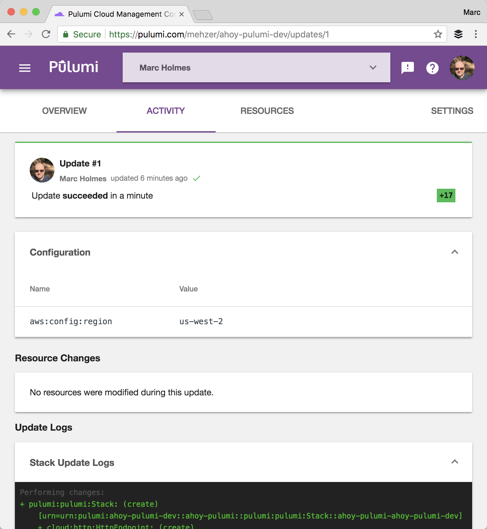 The output also contained a permalink to the Pulumi Cloud. Select that link to review the stack in the web UI, examine logs and resource usage, and learn how you can invite friends and coworkers to collaborate on stacks.
